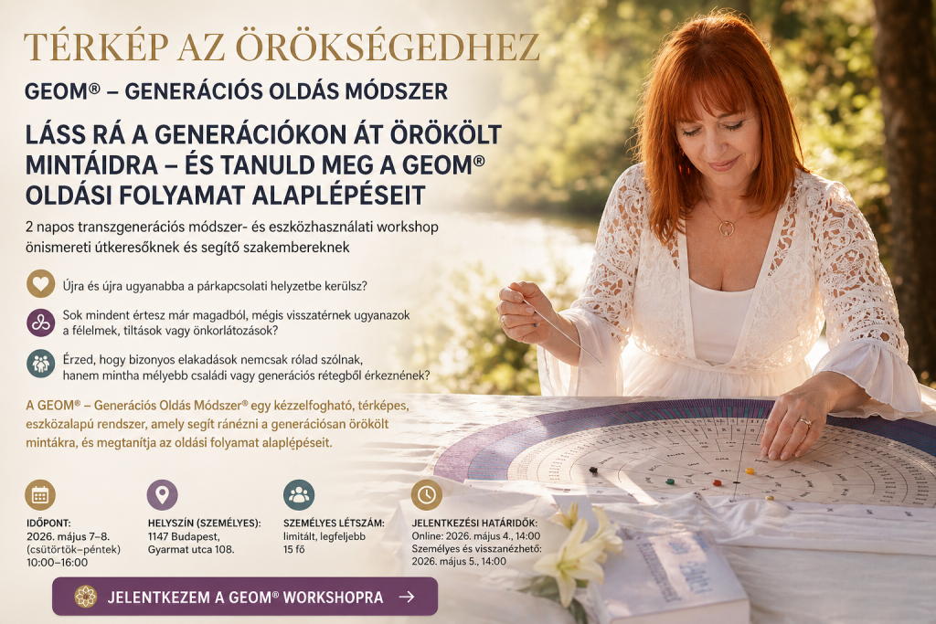 A GEOM® önismereti, transzgenerációs és szellemi-lelki megközelítésű módszer. Nem helyettesít orvosi, pszichoterápiás vagy pszichiátriai ellátást. A workshop célja a belső minták felismerése, az oldási szemlélet megismerése és a módszer alapjainak elsajátítása.